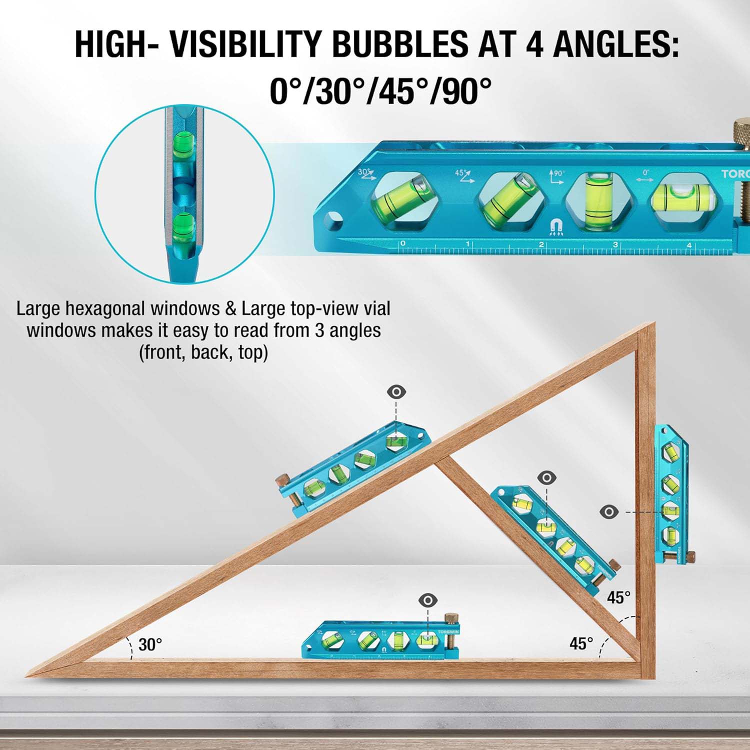 Η παρουσία φυσαλίδων υψηλής ορατότητας σε 4 γωνίες (0°/30°/45°/90°) είναι ένα μεγάλο πλεονέκτημα. Αυτές οι φυσαλίδες είναι σαφώς ορατές από διαφορετικούς προσανατολισμούς, πράγμα που σημαίνει ότι είτε κάνουμε μετρήσεις σε τυπικές οριζόντιες ή κάθετες γωνίες είτε σε συγκεκριμένες λοξές γωνίες όπως 30° ή 45°, μπορούμε να λάβουμε ακριβείς μετρήσεις. Αυτή η λειτουργία φυσαλίδων πολλαπλών γωνιών βελτιώνει σημαντικά την ευελιξία του επιπέδου μας. Η ακρίβεια της ανάγνωσης ενισχύεται επειδή οι φυσαλίδες είναι βαθμονομημένες με ακρίβεια. Για παράδειγμα, κατά τη μέτρηση της κλίσης μιας κεκλιμένης επιφάνειας υπό γωνία 45°, η θέση της φυσαλίδας μπορεί να μας δώσει μια πολύ ακριβή ένδειξη της γωνίας, με ποσοστό σφάλματος έως 0,05° σε σύγκριση με επίπεδα με λιγότερο ακριβή βαθμονόμηση φυσαλίδων.