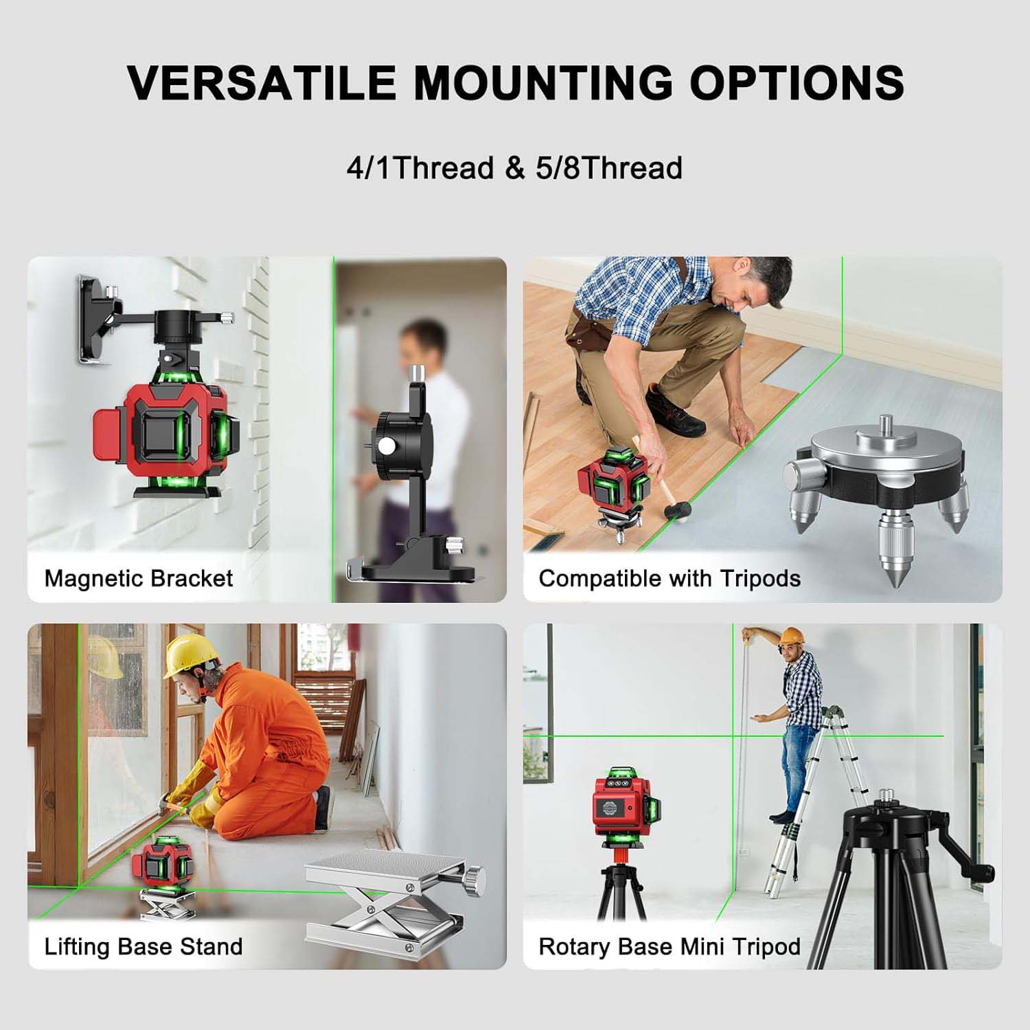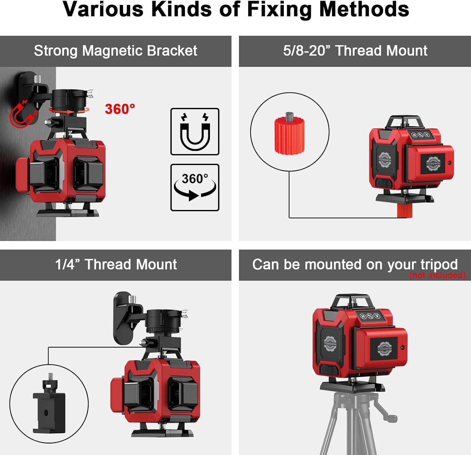 1. Διάφορες μέθοδοι στερέωσης:Είναι εξοπλισμένο με ισχυρό μαγνητικό στήριγμα, το οποίο παρέχει έναν σταθερό και βολικό τρόπο στερέωσης της στάθμης του λέιζερ σε πολλές περιπτώσεις. Η βάση σπειρώματος 5/8 - 20" επιτρέπει τη σύνδεση με συγκεκριμένες συσκευές ή δομές με αυτόν τον τύπο σπειρώματος. Η βάση σπειρώματος 1/4" προσφέρει επίσης μια άλλη επιλογή τοποθέτησης, αυξάνοντας τη συμβατότητά της με διάφορα αξεσουάρ.